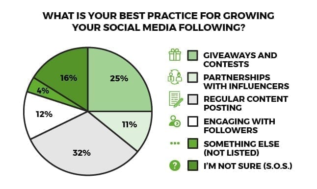 Not surprisingly, the results were widely mixed. Even more not surprisingly, the most commonly reported best practice for growing your social media following was just regular ol’ content posting. It doesn’t mean that the other strategies like giveaways and using contest software doesn’t help.