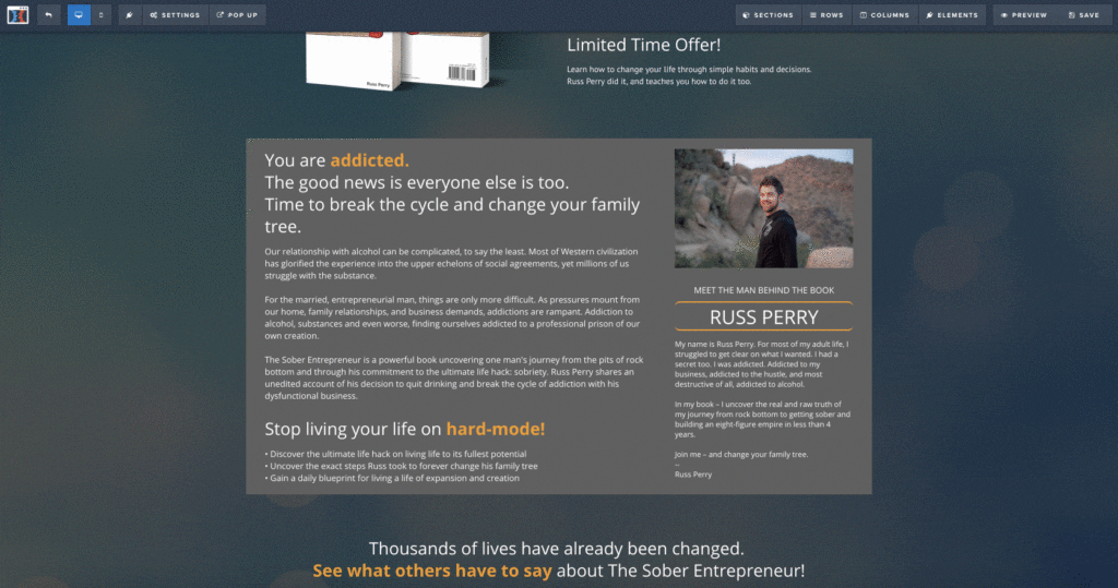 Real-World Application: Our goal was to sell Russ Perry’s book, The Sober Entrepreneur. We used the Sales Funnel and decided to go straight to the order page (instead of starting with an optin page) because Russ had already created an optin page where you could get the first chapter from his book for free before it was officially released.