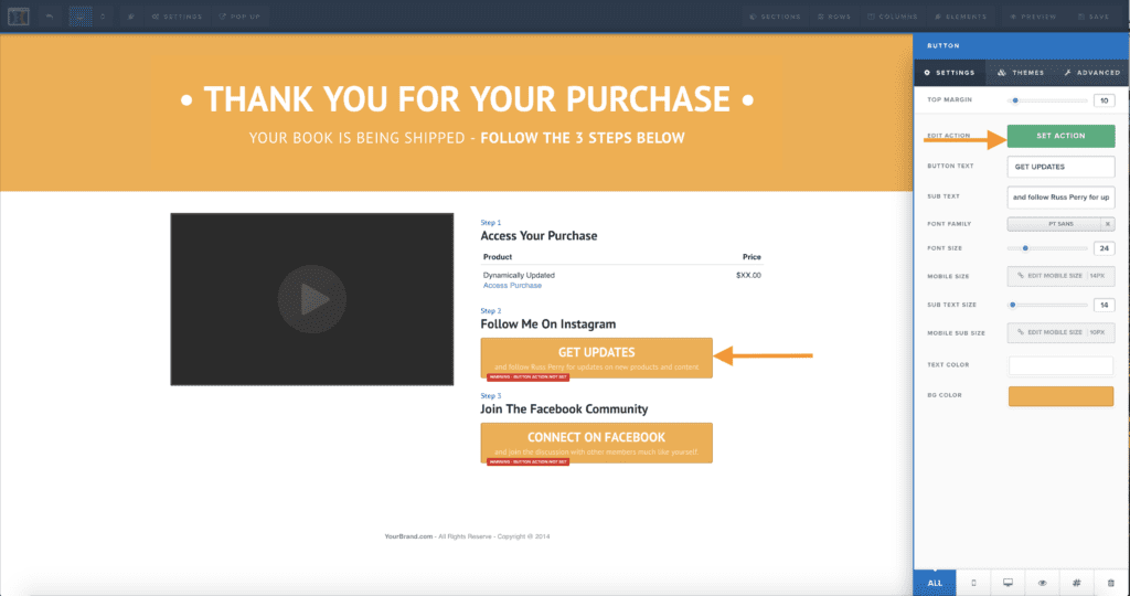 I am going to use a two column row and put the Wistia video on the left and the purchase information and CTAs on the right side. In the subheadline, I specified that I want the new customers to follow 3 steps – confirm their purchase details, follow Russ on Instagram, and follow him on Facebook.
